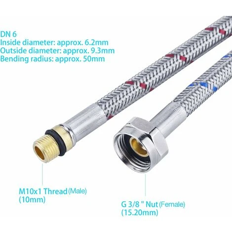 Color as shownSize:60 cm Weight: 150 grams Note:The dimensions at both pipe ends are G3/8 inch and M10.Please confirm the size of the faucet to be connected before ordering. Flexible in use: Super flexible material, very well suited as a faucet connection for direct connection to kitchen and bathroom fittings.Note: Cannot be used as an extension pipe Plumbing accessories: armored weaving pipes, stainless steel outer layer and long service life.The crease-free and close-meshed mesh ensures particularly high stability.