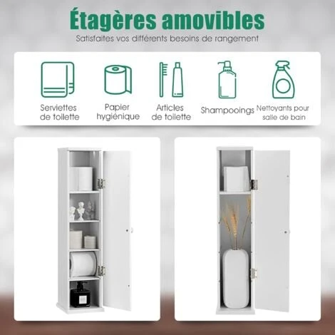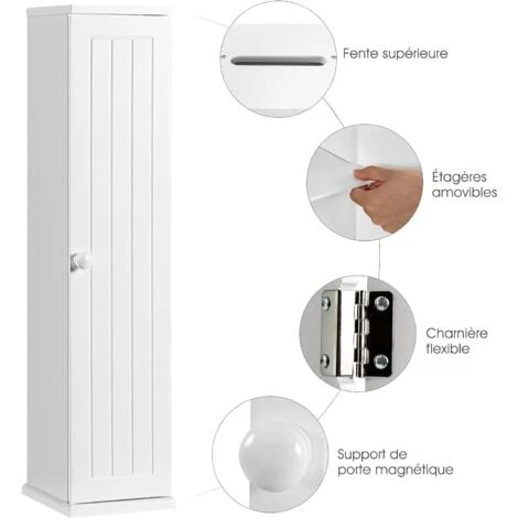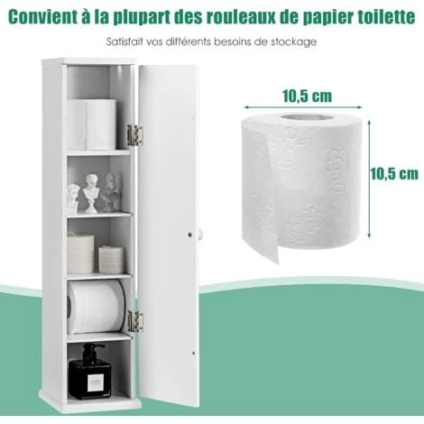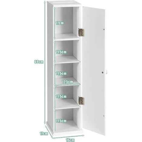 Our paper towel cabinet provides excellent storage solutions for bathrooms with limited space. With a dimension of 16x17x69cm(L x W x H), this cabinet is suitable for narrow space in bathroom and provides you with ample storage space for roll papers and other toilet items. Three detachable shelves give you access to customized storage heights. Featuring sturdy MDF construction, this cabinet with white finish will match with any existing decor. And it is also easy to clean. It is purpose in a slim space at a great value, fit the perfect size between the sink vanity and toilet, between the wall and dryer, between the toilet and the tub. With its fine workmanship, our paper towel cabinet is the best choice for you!