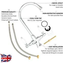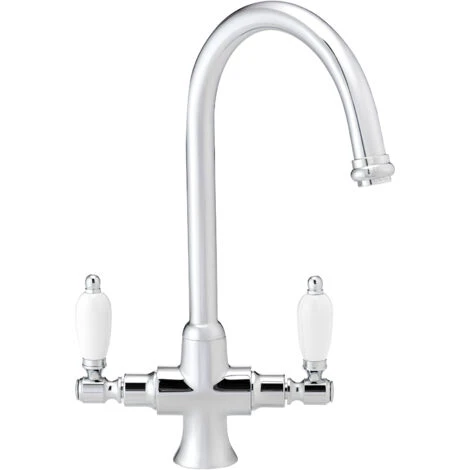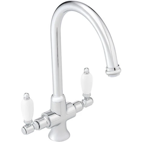 Available in a range of beautiful finishes, the dual flow Chrome Dorchester Kitchen Sink Mixer Tap is the ideal solution for any classic or farmhouse style kitchen. Choose from antique bronze, matte black, brushed nickel, silver chrome and English gold. Featuring a set of elegant white ceramic handles for hot and cold, this tap is best suited for tap holes with a diameter of 35mm and worktops up to 40mm thick. This tap comes complete with all the necessary fittings to help you get set up straight away. Not for you? Browse House of ENKI‘s diverse catalogue of kitchen furnishings, fittings, fixtures and more to help you design the kitchen of your dreams.