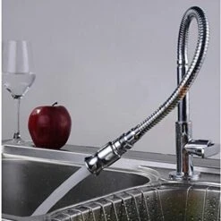 Contemporary and widespread 360 degree swivel flexible sprayer kitchen sink faucets with single tube design, deck mount at the chrome finish</ p>