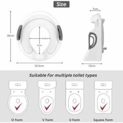 Material: PP+PU+ABS, BPA-free Size: 35*33.5*12cm Removable soft PU cushion Double-sided handrails Fenders Double anti-slip structure Suitable for most types of toilet : If the toilets are square, please measure the width of the toilet in advance (≤33cm).
