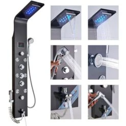 Features: LED water flow, shower head and temperature display to help you choose the most suitable water temperature, multi-output switch to control multiple water effects combined, this shower panel is equipped with LED waterfall, rain shower head, telephone shower, water outlet bathtub, massage jet and spray gun. One can meet your multiple needs and bring you a comfortable day.