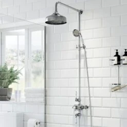 The Park Lane Traditional Shower Valve and Riser System features beautiful traditional styling with dual shower heads and thermostatic technology to bring it into the 21st century. The handset and exposed valve are finished in a bright chrome too with complementing ceramic highlights.