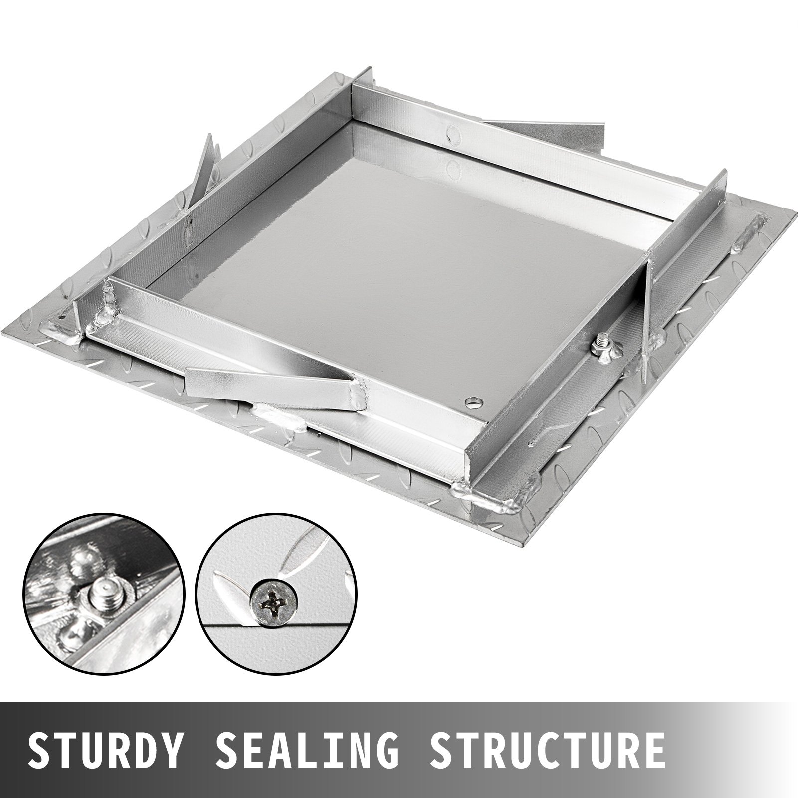- Sealed and Locked:Â The cover is a powder-coated drain cover assembly. Sealing and locking well. The whole cover kit consists of a steel plate, a square frame, and two locking screws, with a center hole for ventilation.
