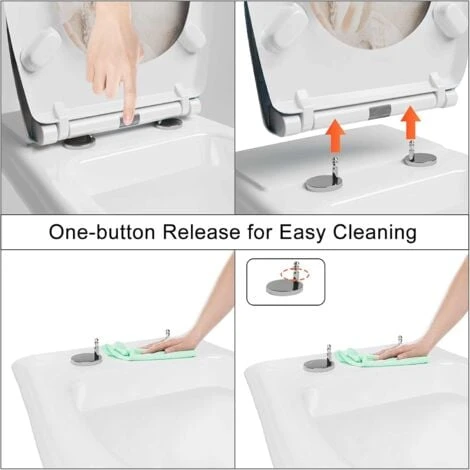 - ?[Quick Release Toilet Seat]:you could remove the loo seat by presing the middle button if you need to clean the lid or seat.Super easy to replace and clean.