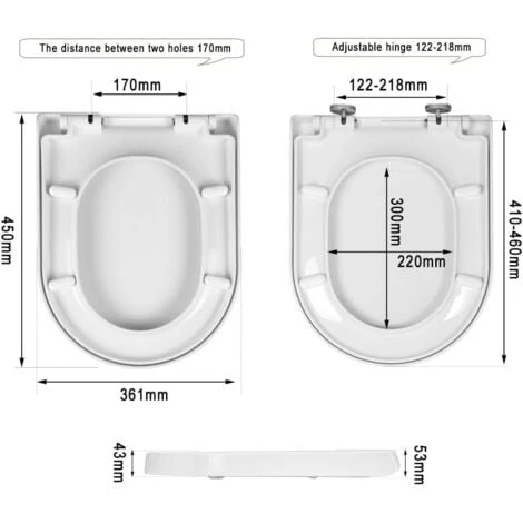 Toilet Seat with Adjustable HingeWith rotatable cutting the attachment. the toilet lid is suitable for a mounting distance between about 12 and 21.9 cm. Before buying. please measure your hole distance of the toilet bowl. | Quick Release Toilet SeatWith Click n ‘Clean function you can directly insert and remove the toilet lid. easy to clean | Toilet Seat with Bottom Fixtures FittingsBottom fixed fixtures and fittings offered.Easy to Assemble | Toilet Seat with Top Fixed FittingsTop fixed fixtures and fittings offered. you could choose to assemble your lid pans from top or bottom as your needed |